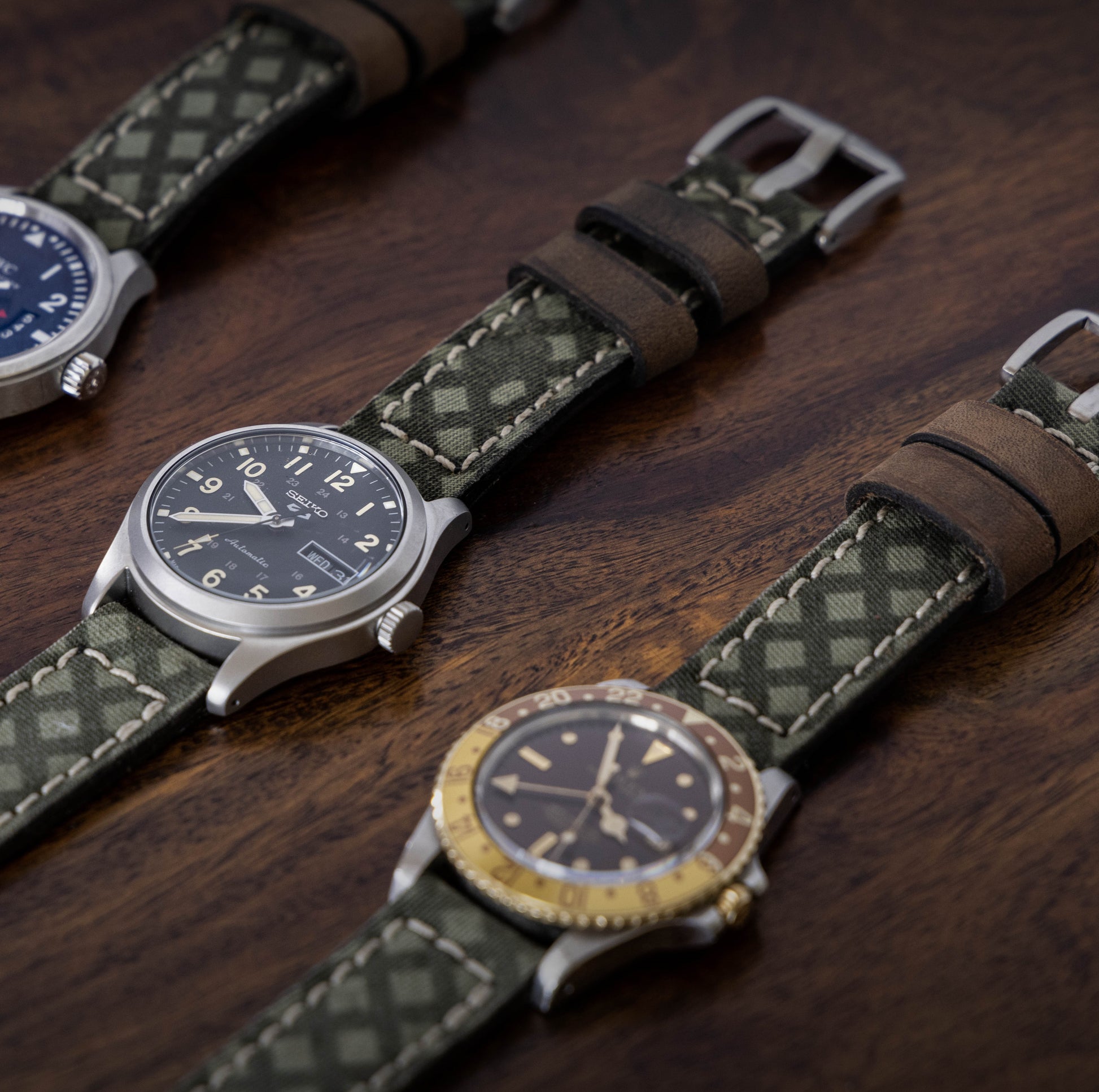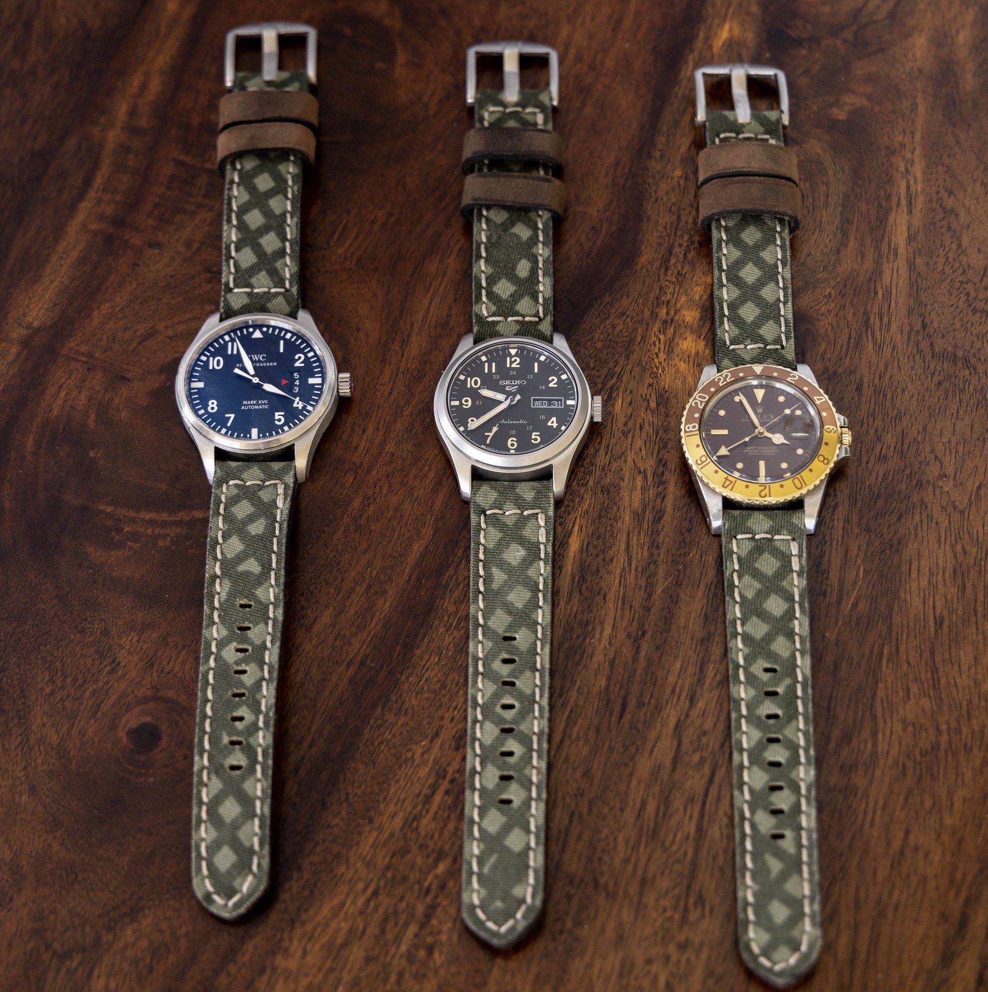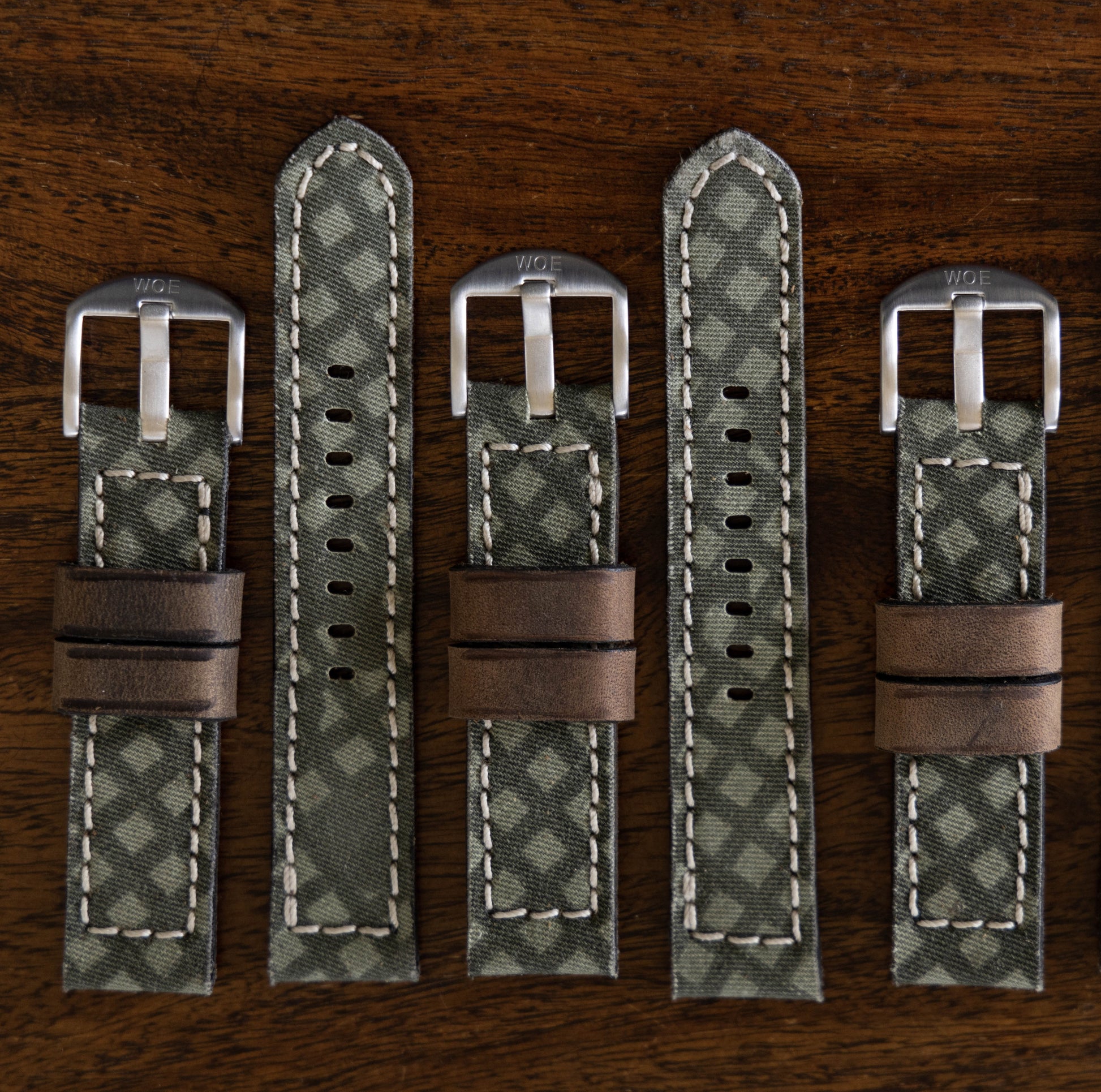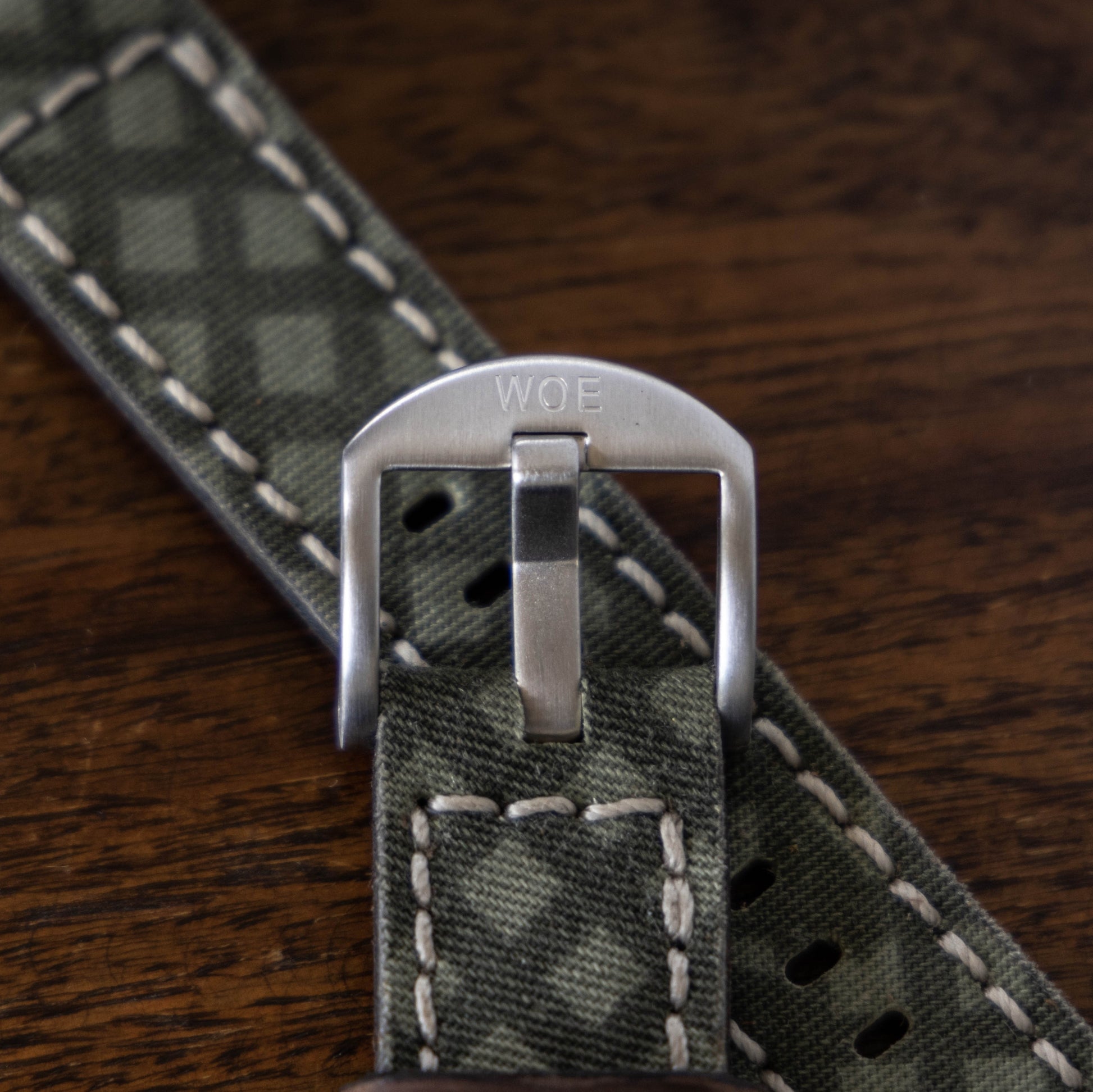 The watch strap contains a W.O.E. stamp inside the strap based on the OSS Spearhead, and signature “WOE.” Designed for the quiet professional.  Like a great watch, the strap is a tool, made to be used and to last. The patina on the leather and fraying of the canvas edge that can develop over years of use is a bonus.