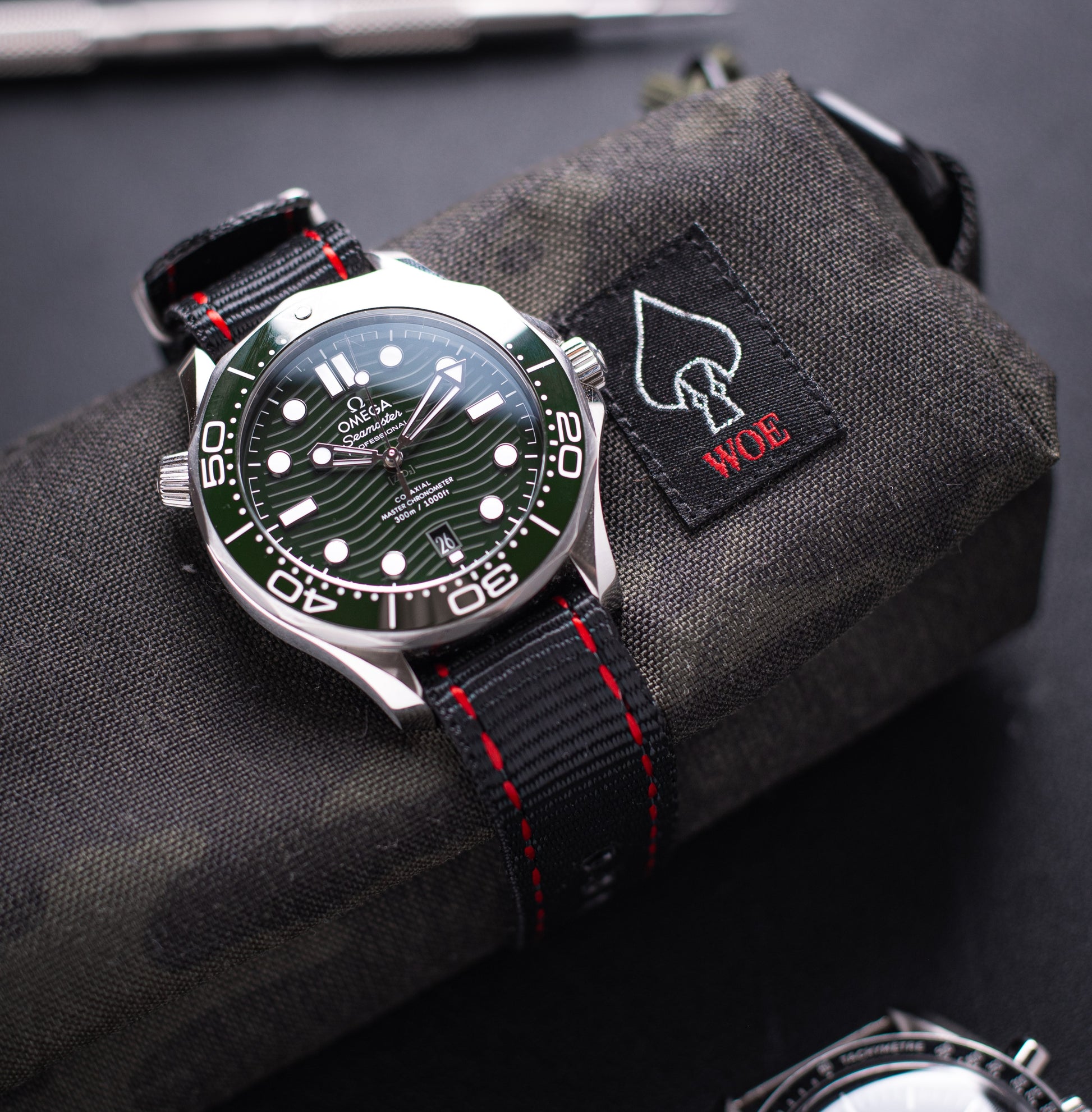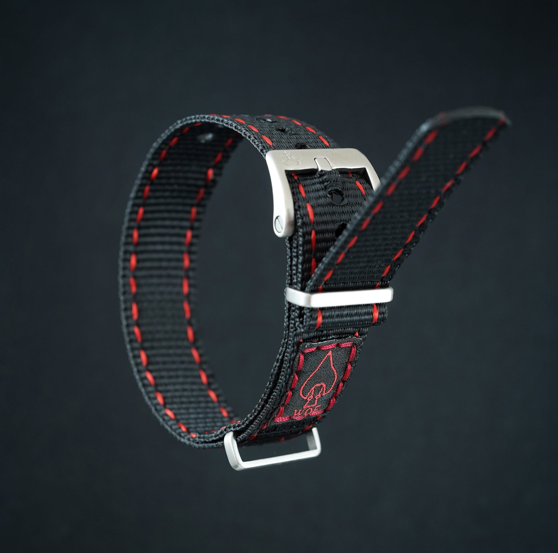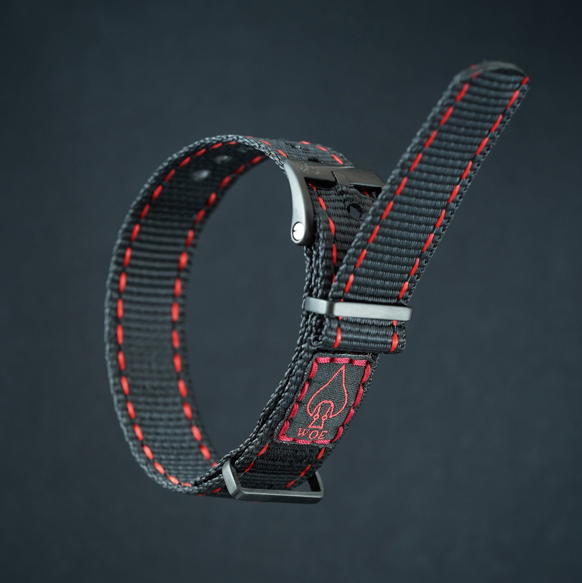 This Limited Edition strap was personally designed by W.O.E. with the input, guidance, and expertise in craftsmanship of the professionals at Z.A. Straps. The 5.0 is a black single pass strap with red side stitching and a red-on-black W.O.E. woven insignia placed in between the strap keepers so that it is not visible when worn. The 5.0 is available in 20 and 22mm sizes and with optional PVD hardware. Like all Z.A. Straps, the 5.0 is woven, sewn, and constructed in the United Kingdom by veteran-owned Z.A. Straps.