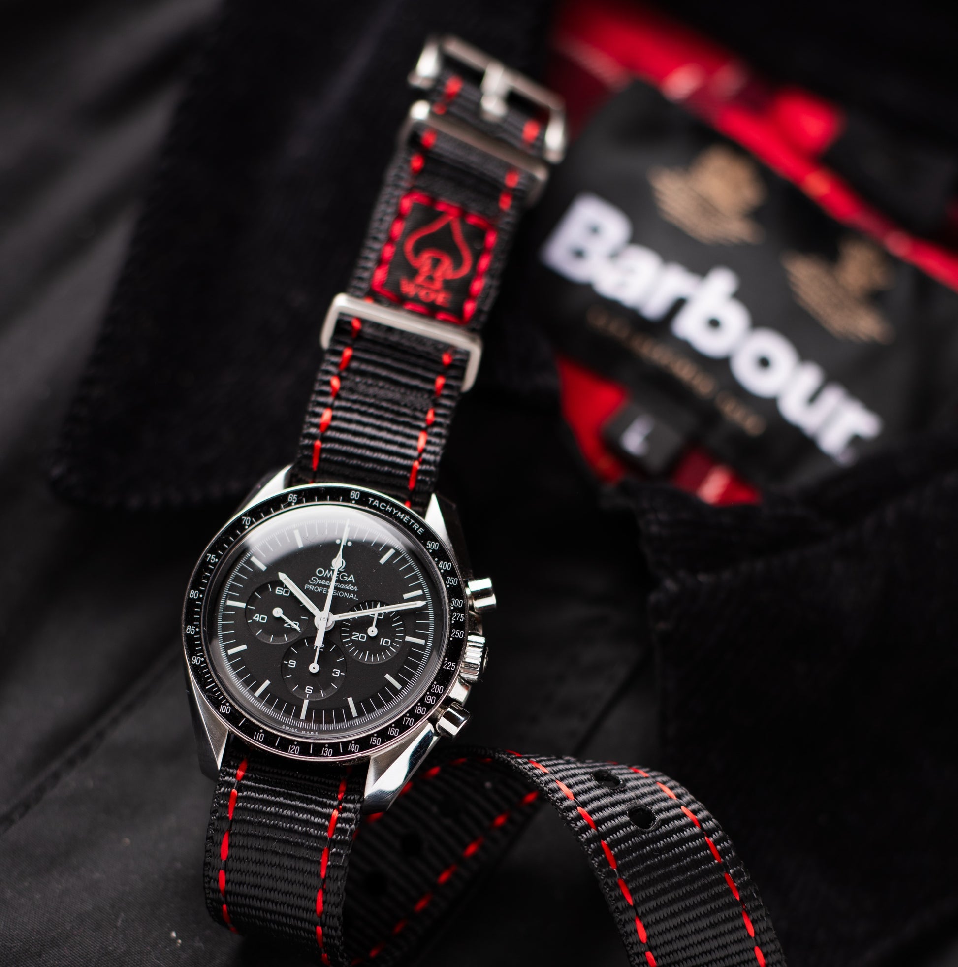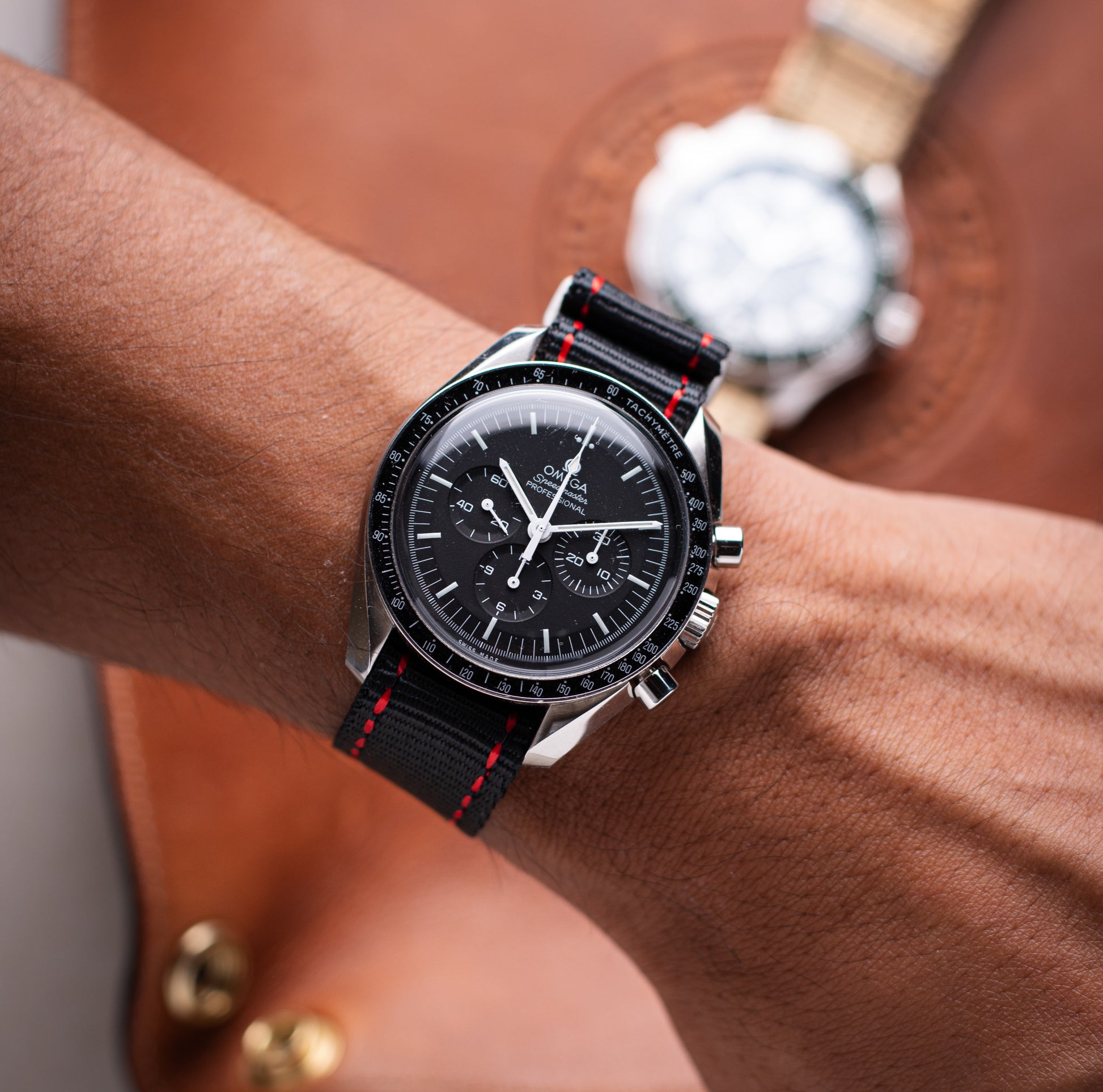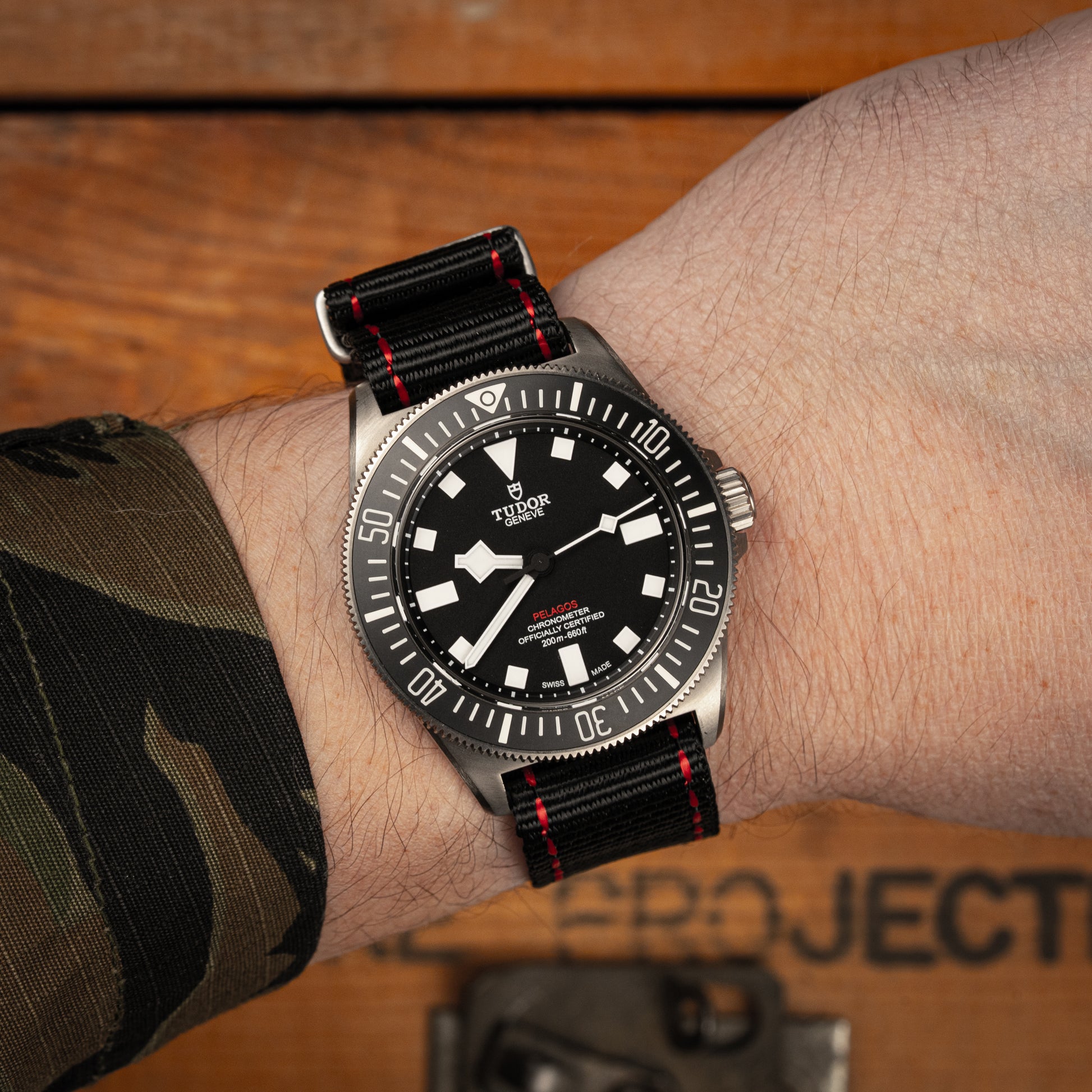 This Limited Edition strap was personally designed by W.O.E. with the input, guidance, and expertise in craftsmanship of the professionals at Z.A. Straps. The 5.0 is a black single pass strap with red side stitching and a red-on-black W.O.E. woven insignia placed in between the strap keepers so that it is not visible when worn. The 5.0 is available in 20 and 22mm sizes and with optional PVD hardware. Like all Z.A. Straps, the 5.0 is woven, sewn, and constructed in the United Kingdom by veteran-owned Z.A. Straps.