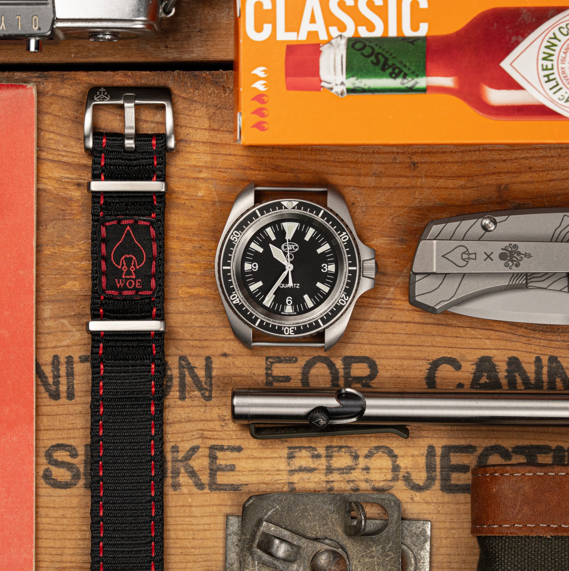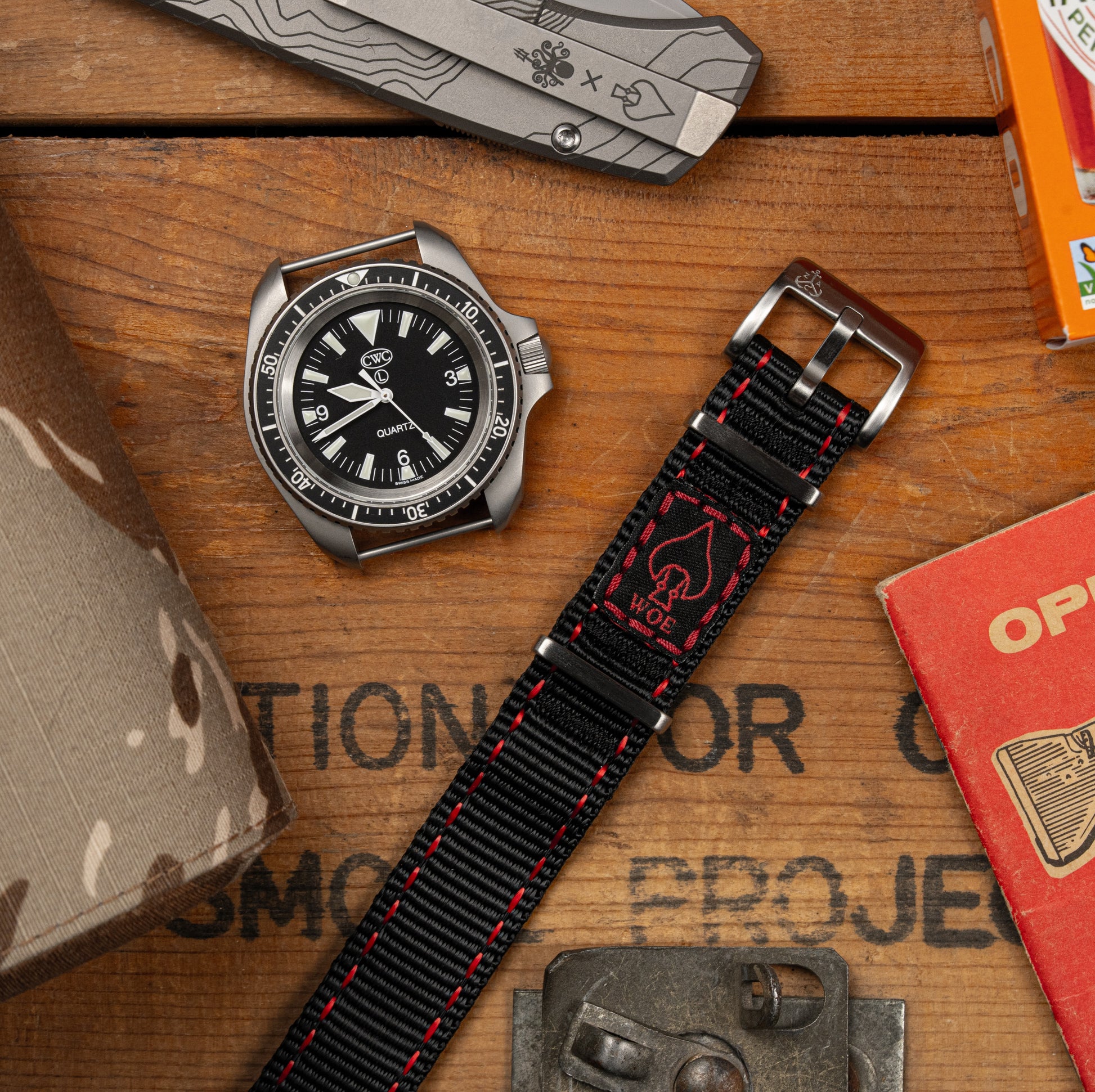While we are typically more subtle with our color choices, for the fifth installment of our collaborative series with Z.A. Straps in the UK, we opted for a slightly more attention-grabbing approach. With black webbing from the UK paired with red stitching and a new red woven patch depicting the W.O.E. Spearhead, this is the W.O.E.-Z.A. 5.0.