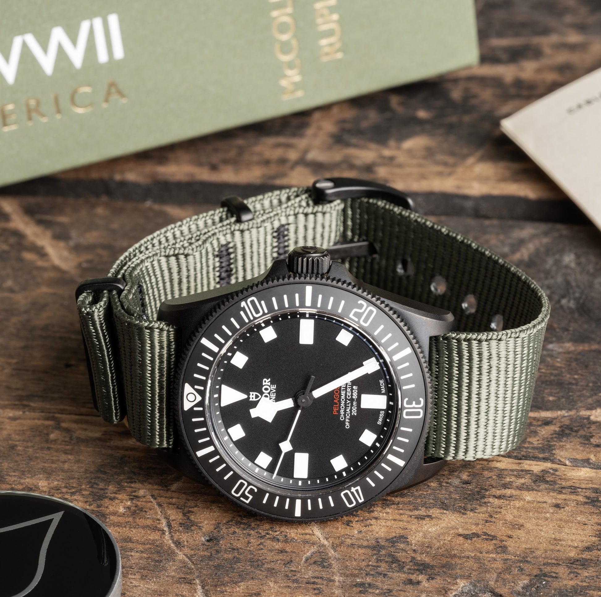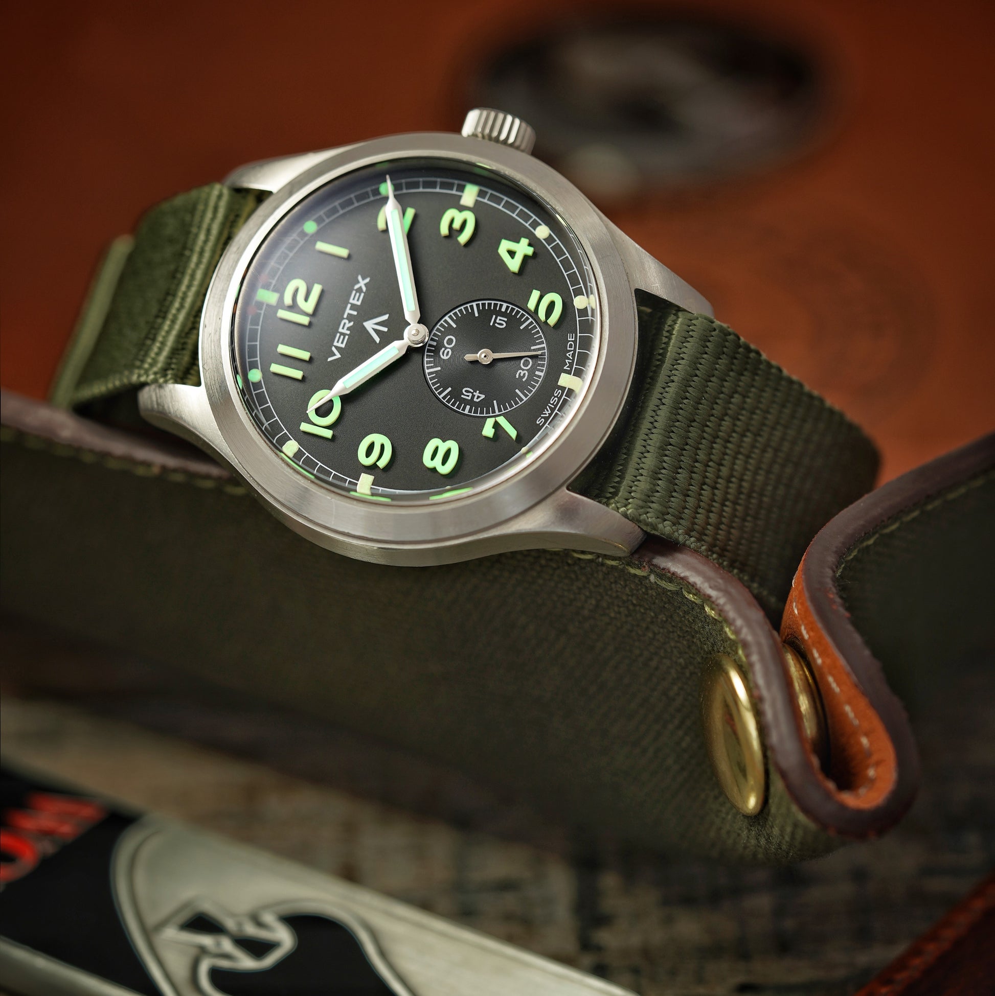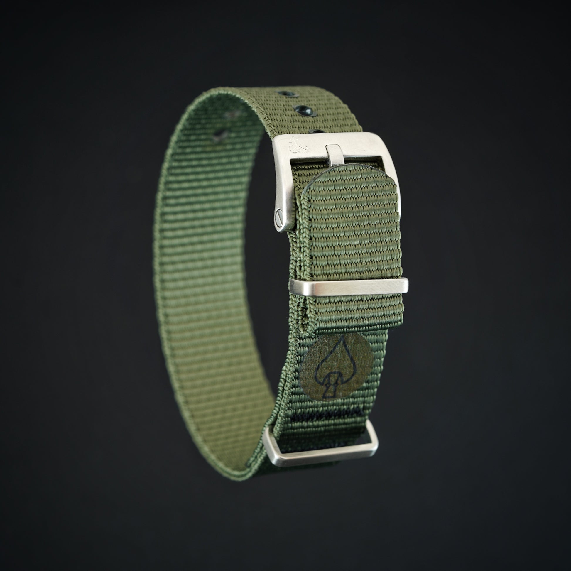 This Limited Edition strap was personally designed by W.O.E. for the “W.O.E. PVD FXD” with the input, guidance and expertise in craftsmanship of the professionals at Z.A. Straps. Olive allied green single pass strap a discreet W.O.E. insignia in between the strap keepers. Brushed 316 Stainless Steel buckle, in both 20 and 22mm sizes with a stainless steel or PVD option buckle. Woven, sewn and constructed in the UK by veteran-owned Z.A. Straps.