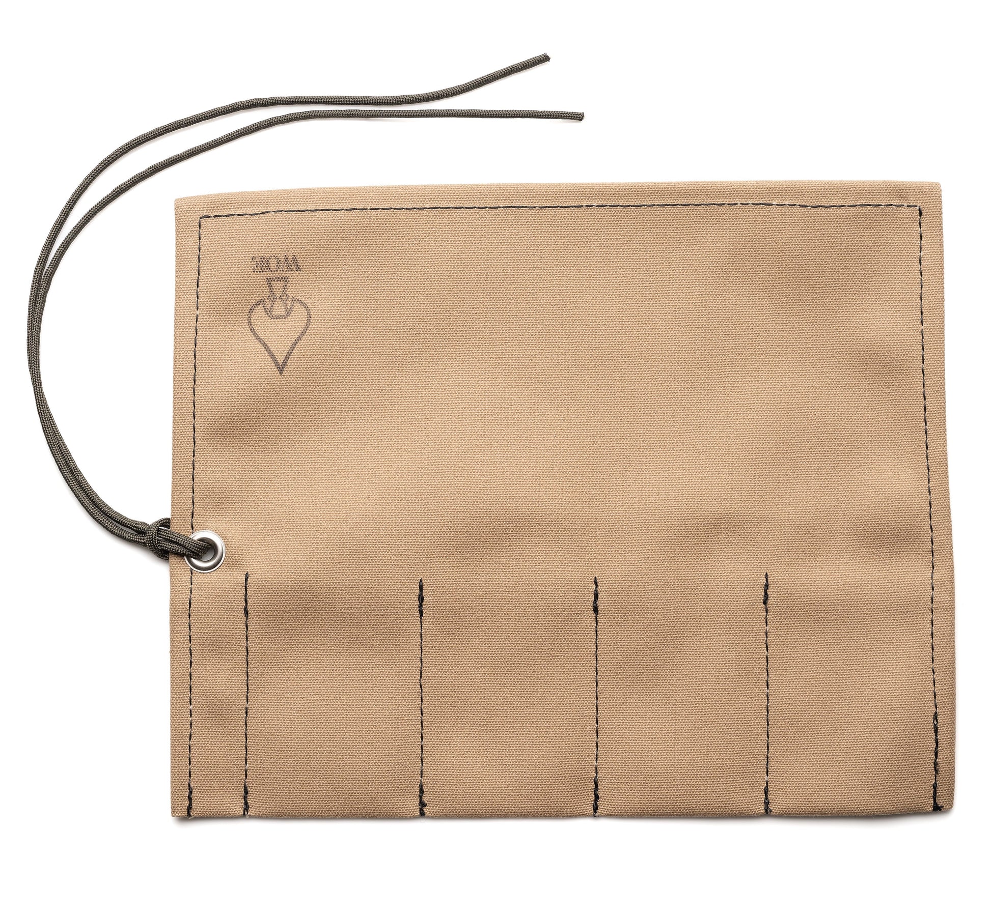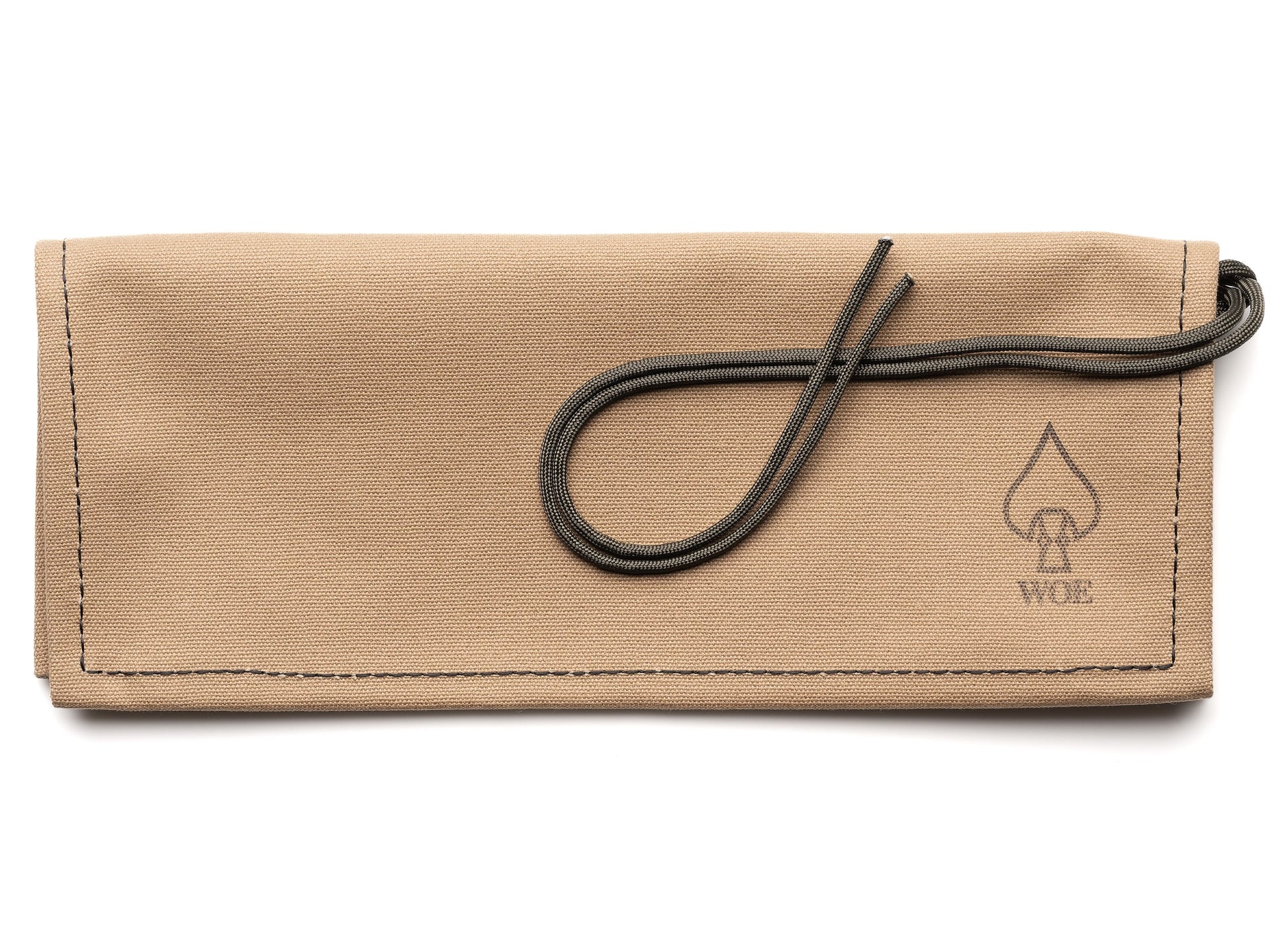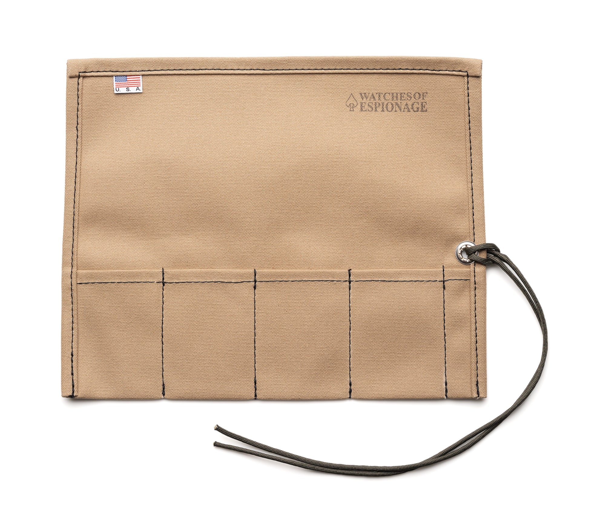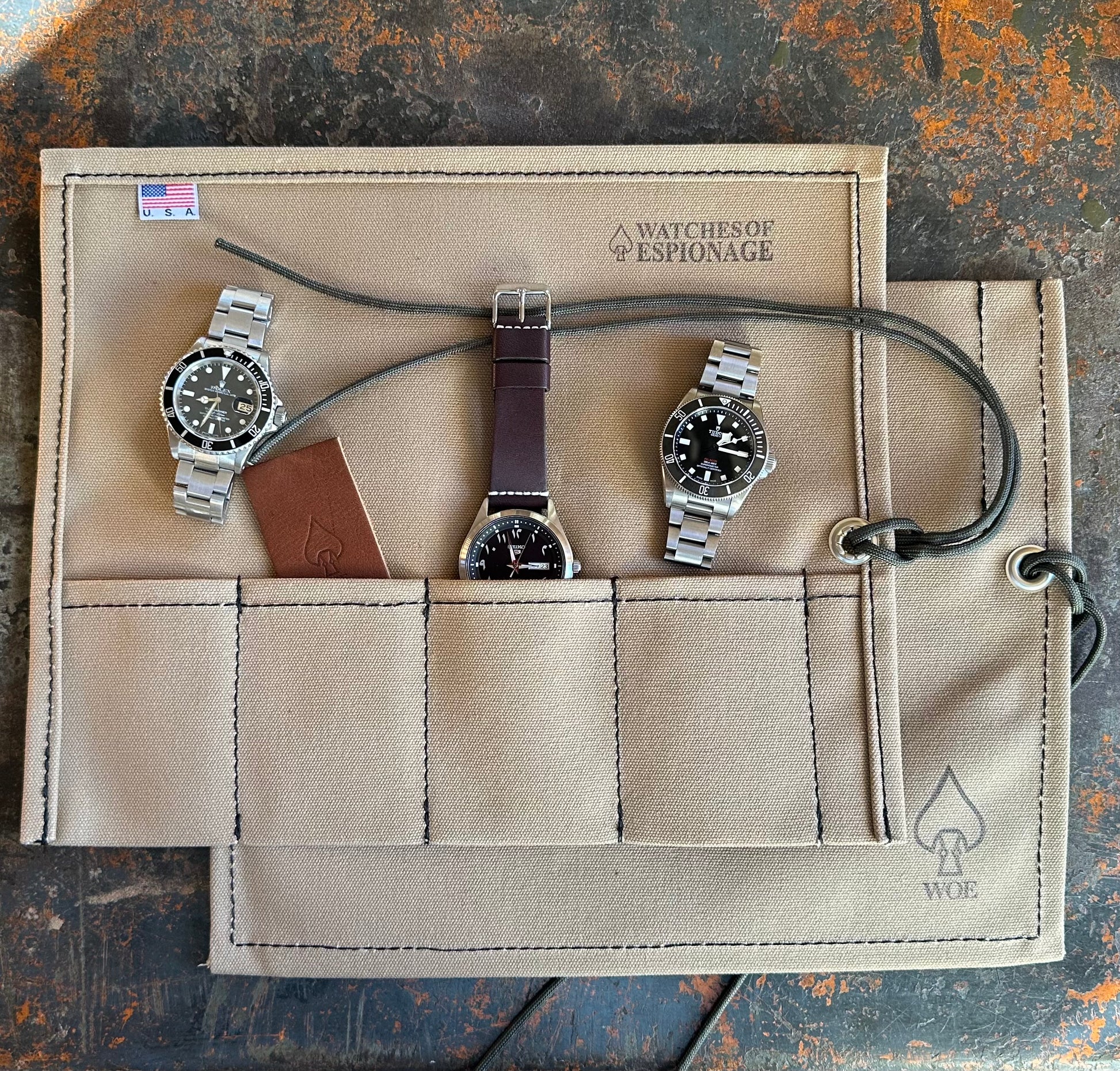 The outside of the roll is hand-stamped with a subtle W.O.E. spearhead insignia and the full Watches of Espionage logo on the inside.  Fold the watch roll up and secure it tight with a dark green 550 parachute cord, a practical and subtle nod to our community.
