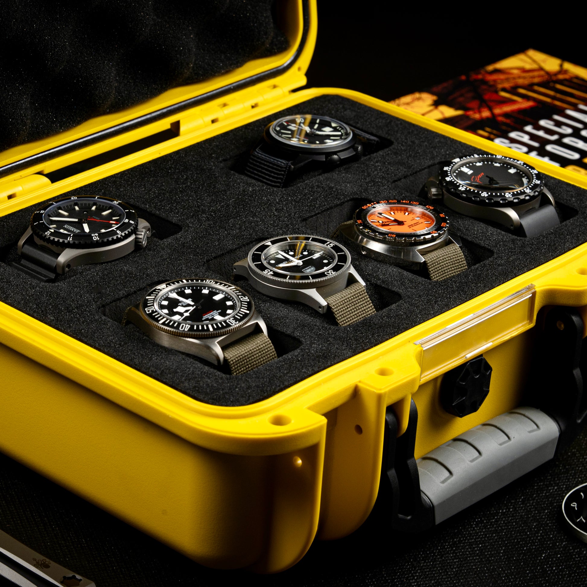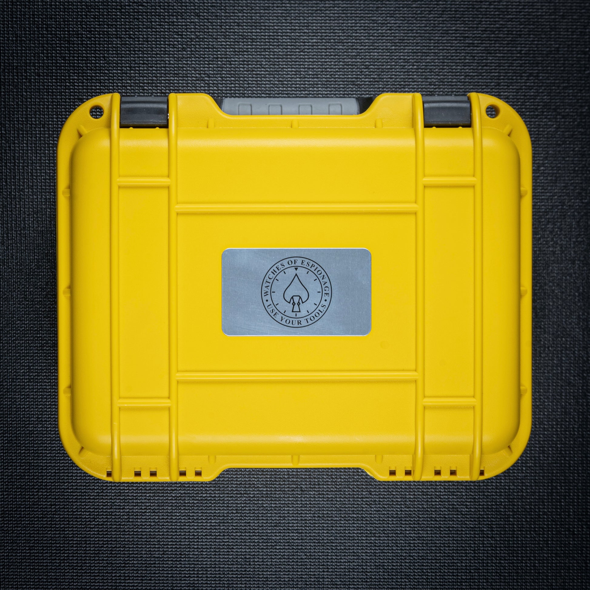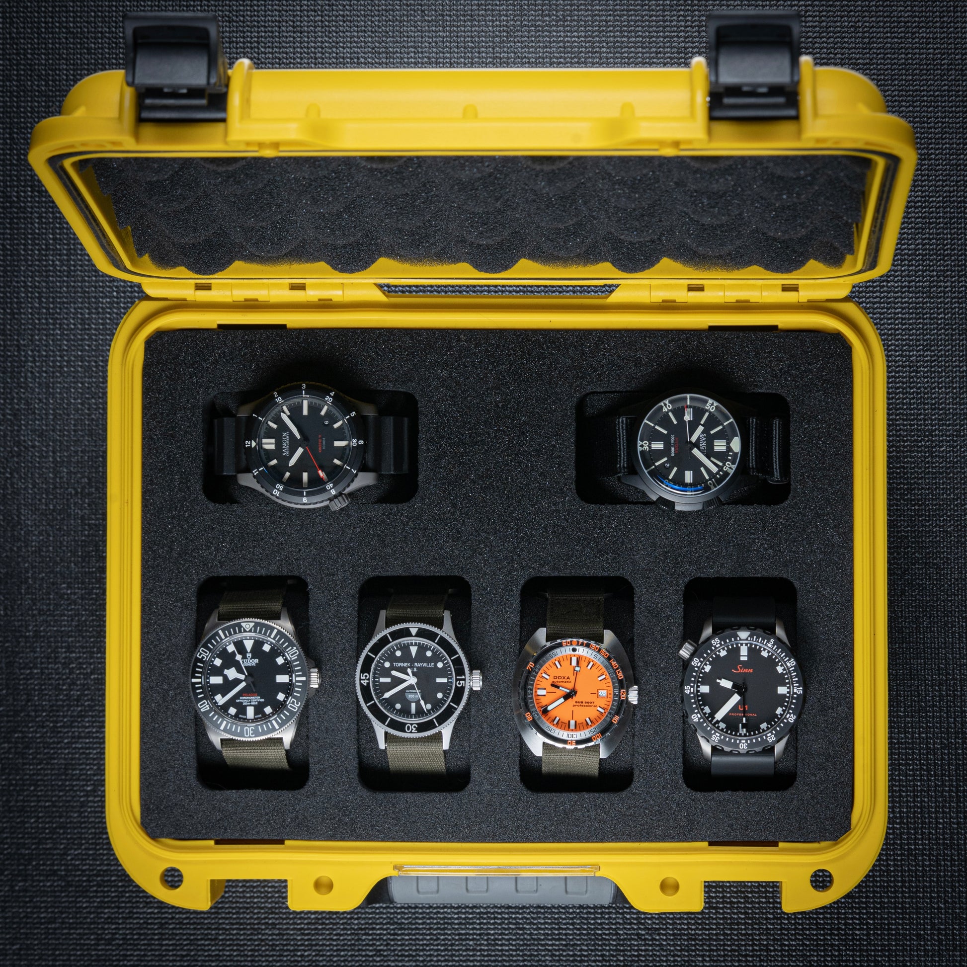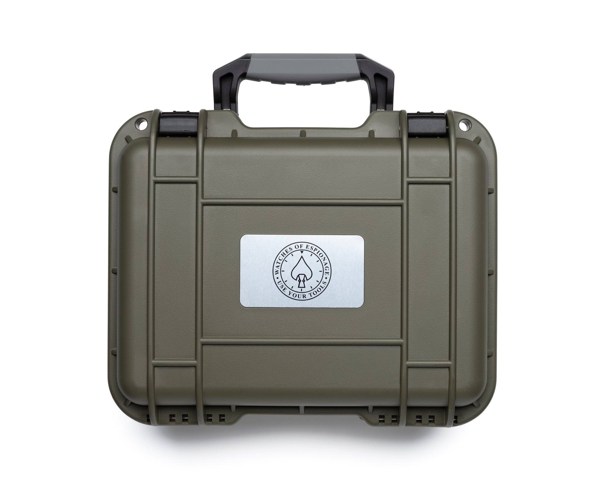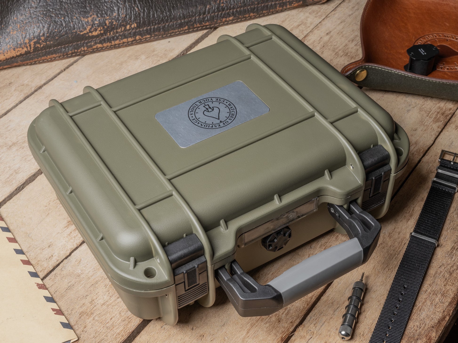 The case firmly holds 6 watches in precut spaces and provides adequate protection from dust, moisture, and prying eyes. The robust dual-locking system keeps water out and is secured with two locking points. Each case has a metal plate with the ‘W.O.E. Use Your Tools” insignia.